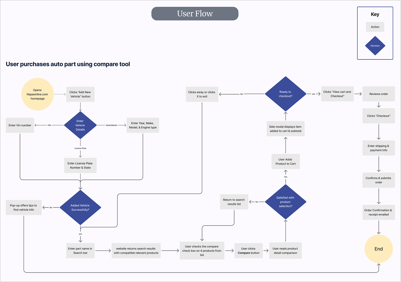 There are multiple ways a user can search for a product, but it was important to focus on the one most likely to be used — the search bar. In this flow, the user adds a vehicle, searches for a part, selects 4 to compare, adds the chosen product to the cart and checks out. This flow gave our team a clear vision of the user path and the screens to design.